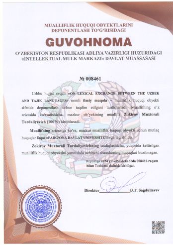876 | №008461 | Ilmiy maqola – "ON LEXICAL EXCHANGE BETWEEN THE UZBEK AND TAJIK LANGUAGES" | Zokirov Muxtorali Turdaliyevich (100%) | FARG‘ONA DAVLAT UNIVERSITETI | 12/25/2024 | ![]() |