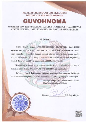875 | №008462 | Ilmiy maqola – "РАҚАМЛАШТИРИШ ШАРОИТИДА ЗАМОНАВИЙ ТЕХНОЛОГИЯЛАР АСОСИДА ТАЪЛИМ МУАССАСАСИНИ БОШҚАРИШ" | Jo‘rayev Voxid Tojimamatovich (100%) | FARG‘ONA DAVLAT UNIVERSITETI | 12/25/2024 | ![]() |