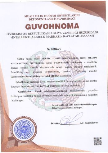 874 | №008463 | O’quv-uslubiy qo‘llanma– "KICHIK YOSHLI BOKSCHILARDA KUCH SIFATINI RIVOJLANTIRISH METODIKASI" | Xamrakulov Rasul Abdusattarovich (100%) | FARG‘ONA DAVLAT UNIVERSITETI | 12/25/2024 | ![]() |