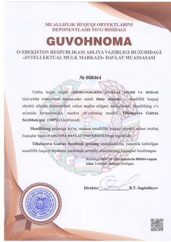 873 | №008464 | Ilmiy maqola – "TILSHUNOSLIKDA AYOLLAR KIYIMI VA MODASI LUG‘ATINI O‘RGANISH MASALASI" | Tillabayeva Gulrux Soxibbek qizi (100%) | FARG‘ONA DAVLAT UNIVERSITETI | 12/25/2024 | ![]() |