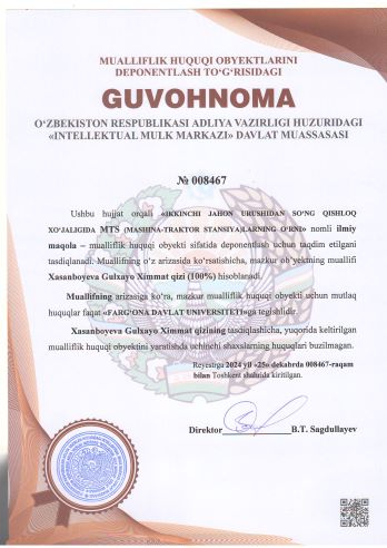 870 | №008467 | Ilmiy maqola – "IKKINCHI JAHON URUSHIDAN SO‘NG QISHLOQ XO‘JALIGIDA MTS (MASHINA-TRAKTOR STANSIYA)LARNING O‘RNI" | Xasanboyeva Gulxayo Ximmat qizi (100%) | FARG‘ONA DAVLAT UNIVERSITETI | 12/25/2024 | ![]() |
