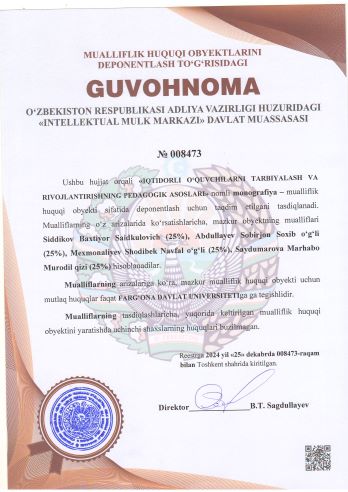 864 | №008473 | Monografiya –"IQTIDORLI O‘QUVCHILARNI TARBIYALASH VA RIVOJLANTIRISHNING PЕDAGOGIK ASOSLARI" | Siddikov Baxtiyor Saidkulovich (25%), Abdullayev Sobirjon Soxib o‘g‘li (25%), Mexmonaliyev Shodibek Navfal o‘g‘li (25%), Saydumarova Marhabo Murodil qizi (25%) | FARG‘ONA DAVLAT UNIVERSITETI | 12/25/2024 | ![]() |