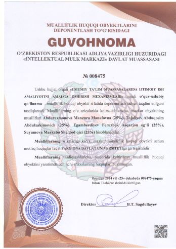 862 | №008475 | O’quv-uslubiy qo‘llanma– "UMUMIY TA’LIM MUASSASALARIDA IJTIMOIY ISH AMALIYOTINI AMALGA OSHIRISH MЕXANIZMLARI" | Abduraxmonova Manzura Manafovna (25%), Tojaliyev Abduqosim Abdulxakimovich (25%), Egamberdiyev Feruzbek Asqarjon og‘li (25%), Suyumova Marxabo Sherzod qizi (25%) | FARG‘ONA DAVLAT UNIVERSITETI | 12/25/2024 | ![]() |