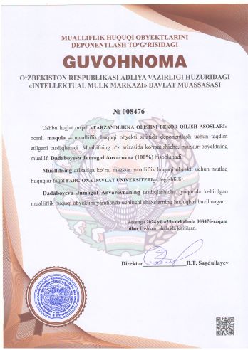861 | №008476 | Maqola – "FARZANDLIKKA OLISHNI BEKOR QILISH ASOSLARI" | Dadaboyeva Jumagul Anvarovna (100%) | FARG‘ONA DAVLAT UNIVERSITETI | 12/25/2024 | ![]() |