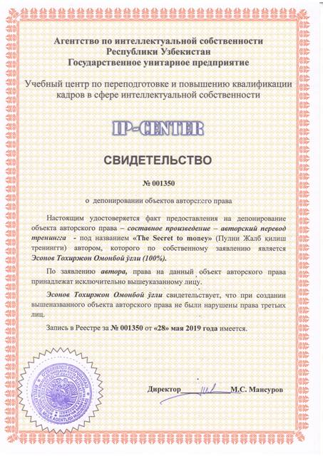 | 8838 | №001350 | Составное произведение - авторский перевод тренинга - "The Secret to money" (Пулни Жалб қилиш тренингги) | Эсонов Тохиржон Омонбой ўғли (100%) | Эсонов Тохиржон Омонбой ўғли | 05/28/2019 | ![]() |