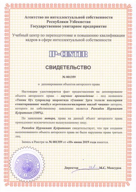 | 8829 | №001359 | Научное произведение - "Типик бўз тупроқлар шароитида ғўзанинг ўрта толали навларини етиштиришнинг мақбул агротехнологияларини ишлаб чиқиш" | Ражабов Нурмамат Қудратович (100%) | Ражабов Нурмамат Қудратович | 06/10/2019 | ![]() |