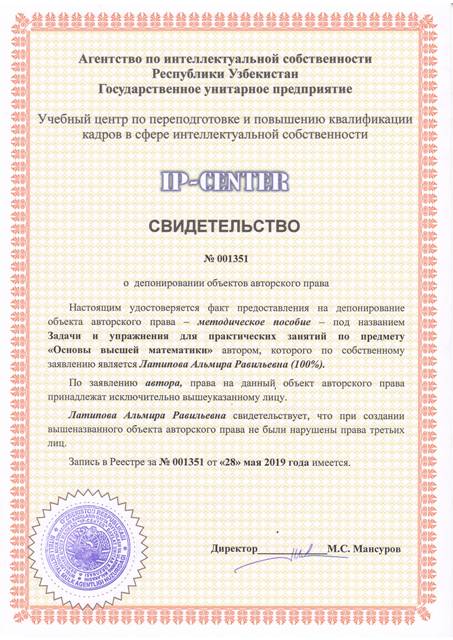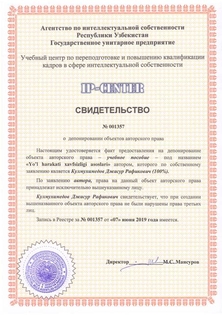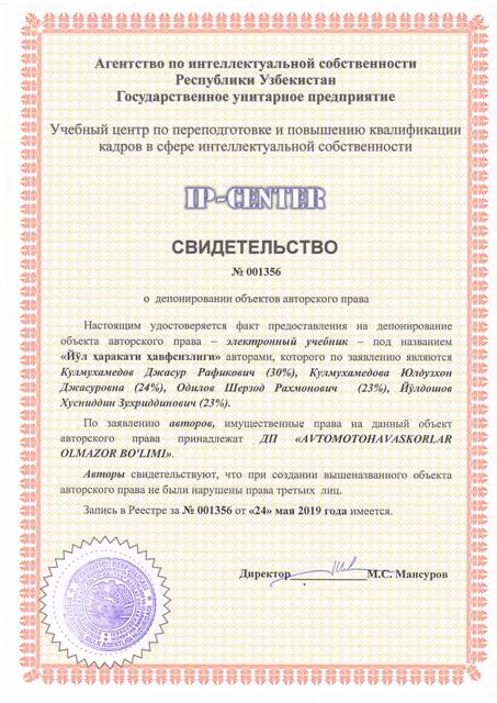 | 8832 | №001356 | Электронный учебник - "Йўл ҳаракати ҳавфсизлиги" | Кулмухамедов Джасур Рафикович (30%), Кулмухамедова Юлдузхон Джасуровна (24%), Одилов Шерзод Рахмонович (23%), Йўлдошов Хусниддин Зухриддинович (23%) | ДП «AVTOMOТОHAVASKORLAR OLMAZOR BO'LIMI» | 05/24/2019 | ![]() |