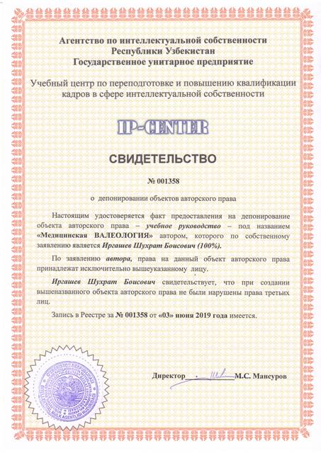 | 8830 | №001358 | Учебное руководство - "Медицинская ВАЛЕОЛОГИЯ" | Иргашев Шухрат Боисович (100%) | Иргашев Шухрат Боисович | 06/03/2019 | ![]() |