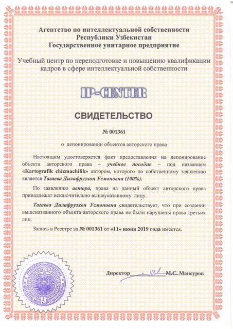| 8827 | №001361 | Учебное пособие - "Kartografik chizmachilik" | Тағаева Дилафрузхон Усмоновна (100%) | Тағаева Дилафрузхон Усмоновна | 06/11/2019 | ![]() |