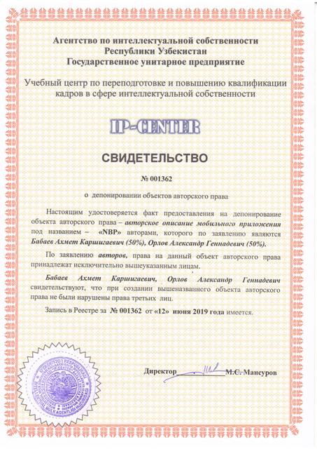 | 8826 | №001362 | Авторское описание мобильного приложения – «NBP» | Бабаев Ахмет Каршигаевич (50%), Орлов Александр Геннадевич (50%) | Бабаев Ахмет Каршигаевич, Орлов Александр Геннадевич | 06/12/2019 | ![]() |