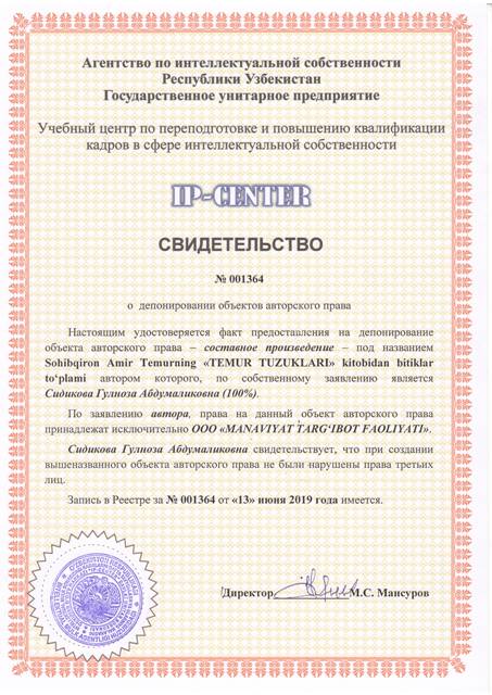 | 8824 | №001364 | Составное произведение - Sohibqiron Amir Temurning "TEMUR TUZUKLARI" kitobidan bitiklar to‘plami | Сидикова Гулноза Абдумаликовна (100%) | ООО «MANAVIYAT TARG‘IBOT FAOLIYATI» | 06/13/2019 | ![]() |