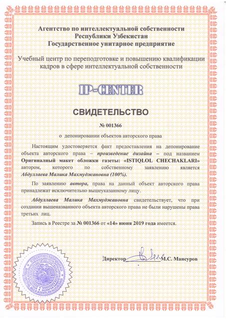 | 8822 | №001366 | Произведение дизайна - Оригиналный макет обложки газеты: "ISTIQLOL CHECHAKLARI" | Абдуллаева Малика Махмуджановна (100%) | Абдуллаева Малика Махмуджановна | 06/14/2019 | ![]() |