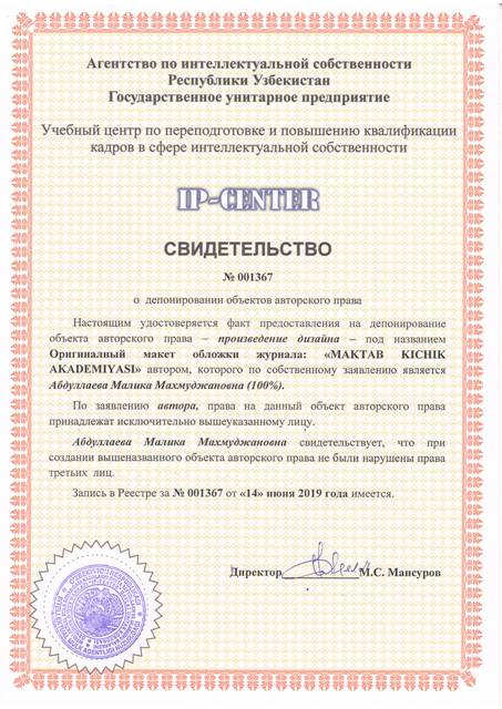 | 8821 | №001367 | Произведение дизайна - Оригиналный макет обложки журнала: "MAKTAB KICHIK AKADEMIYASI" | Абдуллаева Малика Махмуджановна (100%) | Абдуллаева Малика Махмуджановна | 06/14/2019 | ![]() |