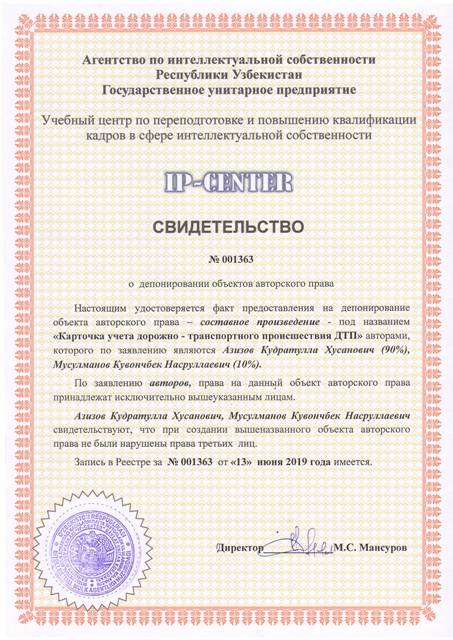 | 8825 | №001363 | Составное произведение - "Карточка учета дорожно - транспортного происшествия ДТП" | Азизов Кудратулла Хусанович (90%), Мусулманов Кувончбек Насруллаевич (10%) | Азизов Кудратулла Хусанович, Мусулманов Кувончбек Насруллаевич | 06/13/2019 | ![]() |