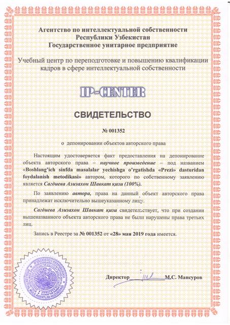 | 8836 | №001352 | Научное произведение – "Boshlang’ich sinfda masalalar yechishga o’rgatishda «Prezi» dasturidan foydalanish metodikasi" | Сагдиева Азизахон Шавкат қизи (100%) | Сагдиева Азизахон Шавкат қизи | 05/28/2019 | ![]() |