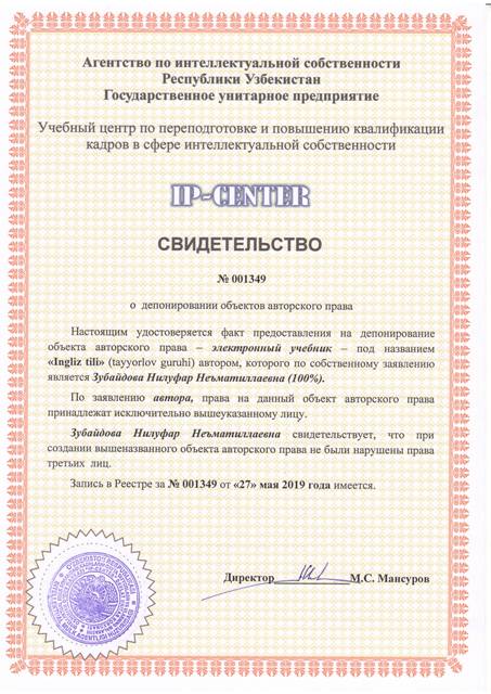 | 8839 | №001349 | Электронный учебник – "Ingliz tili" (tayyorlov guruhi) | Зубайдова Нилуфар Неъматиллаевна (100%) | Зубайдова Нилуфар Неъматиллаевна | 05/27/2019 | ![]() |