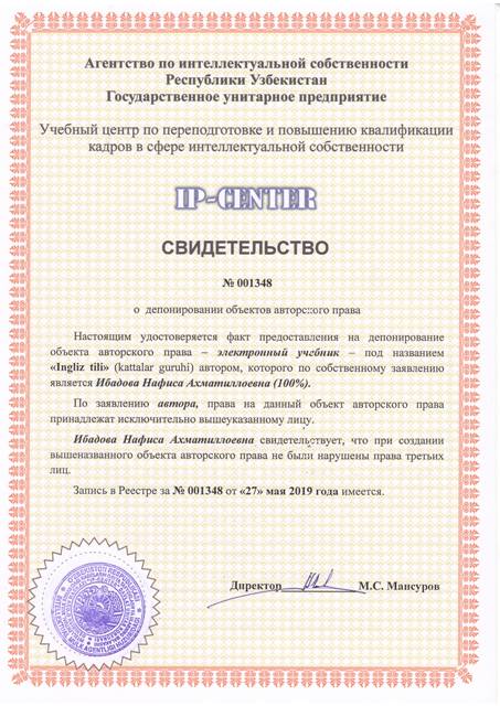| 8840 | №001348 | Электронный учебник – "Ingliz tili" (kattalar guruhi) | Ибадова Нафиса Ахматиллоевна (100%) | Ибадова Нафиса Ахматиллоевна | 05/27/2019 | ![]() |