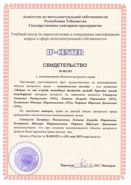 | 8835 | №001353 | Методическое пособие – "Mehnat va uni o‘qitish metodikasi darslarida modulli figuralar yasash texnologiyasi" | Санақулов Хамракул Ризакулович (30%), Ходиева Дилрабо Пиримовна (30%), Рустамова Манзура Миркамаловна (30%), Рафиқов Иброхим Даменович (10%) | Санақулов Хамракул Ризакулович, Ходиева Дилрабо Пиримовна, Рустамова Манзура Миркамаловна, Рафиқов Иброхим Даменович | 05/29/2019 | ![]() |