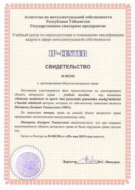 | 8834 | №001354 | Учебное пособие – «Jismoniy madaniyаt va sport» fani jarayonida gimnastika mashg‘ulotlarini o‘tkazish uslubiyati | Мамирова Диларам Тавакуловна (100%) | Мамирова Диларам Тавакуловна | 05/29/2019 | ![]() |