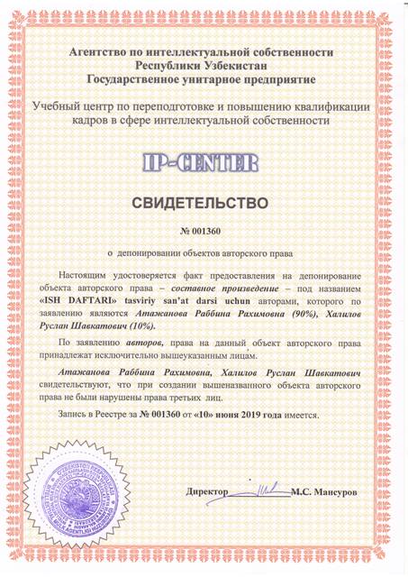 | 8828 | №001360 | Составное произведение – "ISH DAFTARI" tasviriy san’at darsi uchun | Атажанова Раббина Рахимовна (90%), Халилов Руслан Шавкатович (10%) | Атажанова Раббина Рахимовна, Халилов Руслан Шавкатович | 06/10/2019 | ![]() |