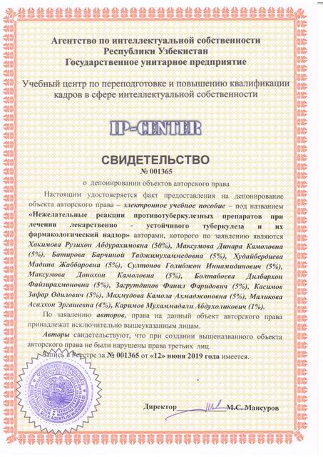 | 8823 | №001365 | Электронное учебное пособие – "Нежелательные реакции противотуберкулезных препаратов при лечении лекарственно - устойчивого туберкулеза и их фармакологический надзор" | Хакимова Рузихон Абдурахимовна (50%), Максумова Динара Камоловна (5%), Батирова Барчиной Таджимухаммедовна (5%), Худайбердиева Мадина Жаббаровна (5%), Султонов Голибжон Иннамидинович (5%), Максумова Донохон Камоловна (5%), Болтабоева Дилбархон Файзирахмоновна (5%), Загрутдинов Фанил Фаридович (5%), Касимов Зафар Одилович (5%), Махмудова Камола Ахмаджоновна (5%), Маликова Асалхон Эргашевна (4%), Каримов Мухаммадали Абдухоликович (1%) | Хакимова Рузихон Абдурахимовна, Максумова Динара Камоловна, Батирова Барчиной Таджимухаммедовна, Худайбердиева Мадина Жаббаровна, Султонов Голибжон Иннамидинович, Максумова Донохон Камоловна, Болтабоева Дилбархон Файзирахмон | 06/12/2019 | ![]() |