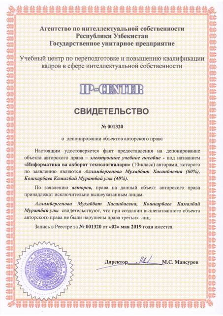 | 8868 | №001320 | Электронное-учебное пособие - «Информатика ва ахборот технологиялари» (10-класс) | Алламбергенова Мухаббат Хасанбаевна (60%), Кошкарбаев Камалбай Муратбай улы (40%) | Алламбергенова Мухаббат Хасанбаевна, Кошкарбаев Камалбай Муратбай улы | 05/02/2019 | ![]() |