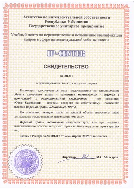 | 8871 | №001317 | Составное произведение - журнал с вертуальной и дополнительной реальностью - «Oasis Uzbekistan» | Воронин Артем Леонидович (100%) | Воронин Артем Леонидович | 04/29/2019 | ![]() |