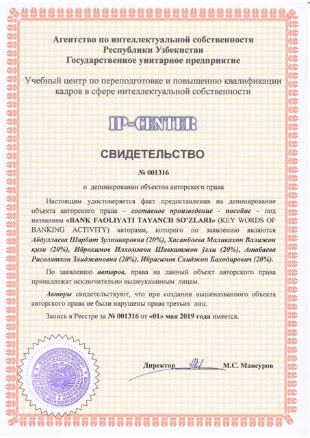 | 8872 | №001316 | Составное произведение - пособие – «BANK FAOLIYATI TAYANCH SO’ZLARI» (KEY WORDS OF BANKING ACTIVITY) | Абдуллаева Шарбат Зулпикаровна (20%), Хасанбоева Маликахон Валижон қизи (20%), Иброхимов Илхомжон Шавкатжон ўғли (20%), Атабаева Рисолатхон Заиджановна (20%), Ибрагимов Саиджон Баходирович (20%) | Абдуллаева Шарбат Зулпикаровна, Хасанбоева Маликахон Валижон қизи, Иброхимов Илхомжон Шавкатжон ўғли, Атабаева Рисолатхон Заиджановна, Ибрагимов Саиджон Баходирович | 05/01/2019 | ![]() |