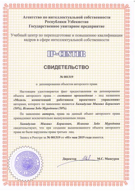 | 8869 | №001319 | Составное произведение - "Модель компетенций работников проектного управления" | Хамидулин Михаил Борисович (50%), Исакова Зебо Муродовна (50%) | Хамидулин Михаил Борисович, Исакова Зебо Муродовна | 05/01/2019 | ![]() |