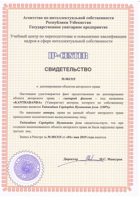 | 8873 | №001315 | Сценарий фильма - "KANTRABANDA" (Vatanparvar) | Таджибаев Сардорбек Нуманжан ўғли (100%) | Таджибаев Сардорбек Нуманжан ўғли | 05/01/2019 | ![]() |