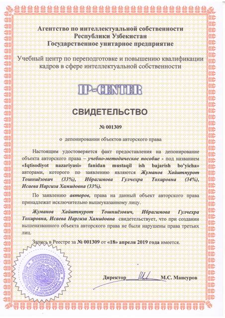 | 8879 | №001309 | Учебно-методическое пособие - "Iqtisodiyot nazariyasi" fanidan mustaqil ish bajarish | Жуманов Хайитмурот Тошниёзович (33%), Ибрагимова Гулчехра Тохировна (34%), Исаева Наргиза Хамидовна (33%) | Жуманов Хайитмурот Тошниёзович, Ибрагимова Гулчехра Тохировна, Исаева Наргиза Хамидовна | 04/18/2019 | ![]() |