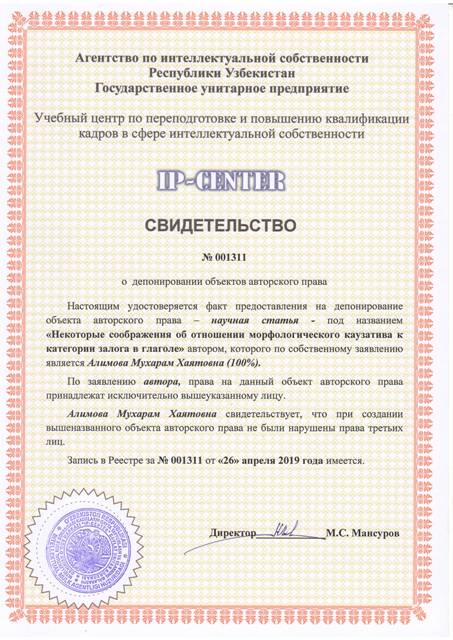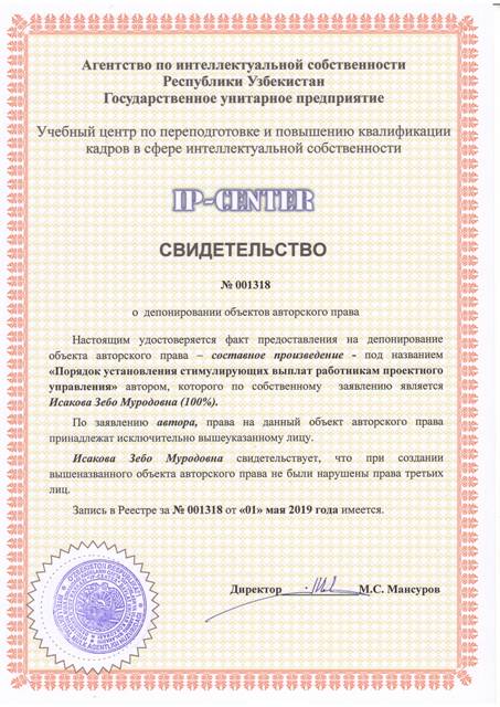 | 8870 | №001318 | Составное произведение - "Порядок установления стимулирующих выплат работникам проектного управления" | Исакова Зебо Муродовна (100%) | Исакова Зебо Муродовна | 05/01/2019 | ![]() |