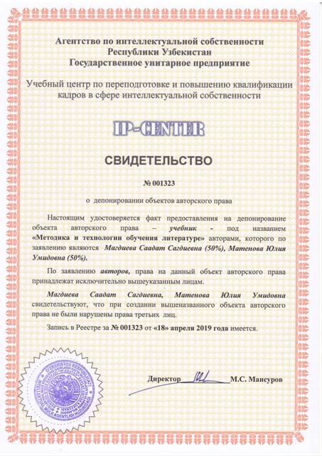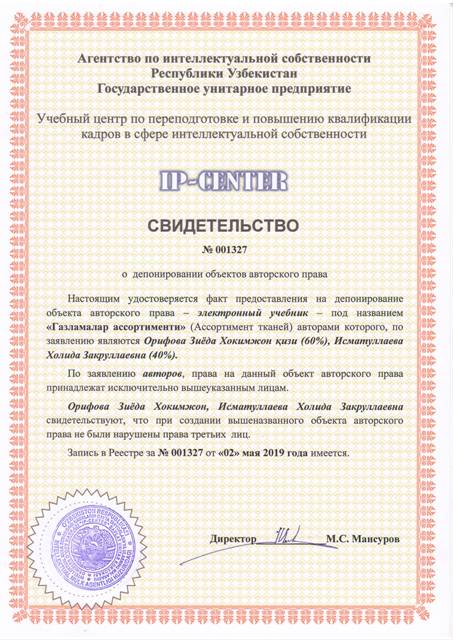 | 8861 | №001327 | Электронный учебник - "Газламалар ассортименти" (Ассортимент тканей) | Орифова Зиёда Хокимжон қизи (60%), Исматуллаева Холида Закруллаевна (40%) | Орифова Зиёда Хокимжон қизи, Исматуллаева Холида Закруллаевна | 05/02/2019 | ![]() |