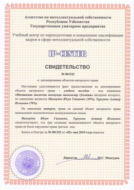 | 8866 | №001322 | Учебное пособие - "Физикадан экологик мазмунда масалалар тўплами" | Махмудов Юсуп Ганиевич (30%), Турсунов Алишер Исоқович (70%) | Махмудов Юсуп Ганиевич, Турсунов Алишер Исоқович | 05/02/2019 | ![]() |