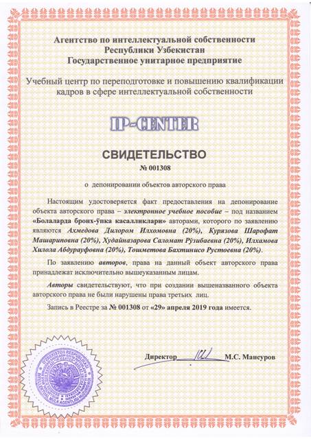 | 8880 | №001308 | Электронное учебное пособие – «Болаларда бронх-ўпка касалликлари» | Ахмедова Дилором Илхомовна (20%), Курязова Шарофат Машариповна (20%), Худайназарова Саломат Рўзибаевна (20%), Илхамова Хилола Абдурауфовна (20%), Тошметова Бахтинисо Рустоевна (20%) | Ахмедова Дилором Илхомовна, Курязова Шарофат Машариповна, Худайназарова Саломат Рўзибаевна, Илхамова Хилола Абдурауфовна, Тошметова Бахтинисо Рустоевна | 04/29/2019 | ![]() |