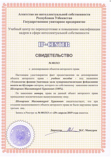 | 8875 | №001313 | Учебное пособие - "Технология фанини ўқитишда ҳалқ ҳунармандчилигидан фойдаланиш восита ва йўллари" | Шомирзаев Махматмурод Хурамович (100%) | Шомирзаев Махматмурод Хурамович | 04/29/2019 | ![]() |