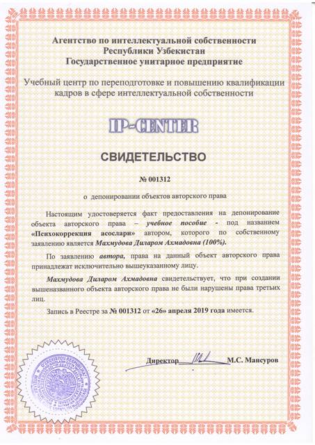 | 8876 | №001312 | Учебное пособие - "Психокоррекция асослари" | Махмудова Диларом Ахмадовна (100%) | Махмудова Диларом Ахмадовна | 04/26/2019 | ![]() |