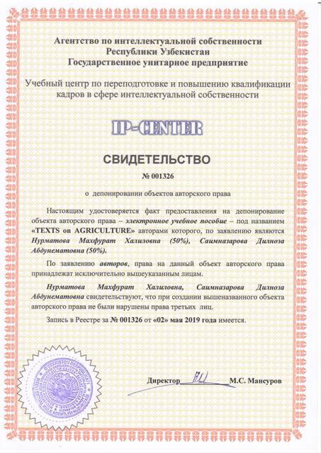 | 8862 | №001326 | Электронное учебное пособие – "TEXTS on AGRICULTURE" | Нурматова Махфурат Халиловна (50%), Саимназарова Дилноза Абдунематовна (50%) | Нурматова Махфурат Халиловна, Саимназарова Дилноза Абдунематовна | 05/02/2019 | ![]() |