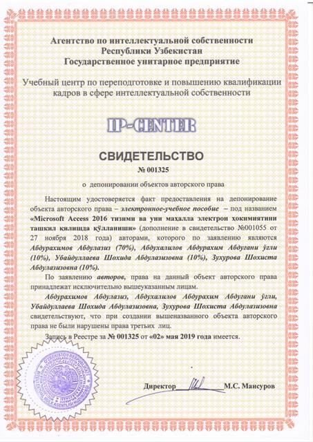 | 8863 | №001325 | Электронное-учебное пособие – «Microsoft Access 2016 тизими ва уни маҳалла электрон ҳокимиятини ташкил қилишда қўлланиши» (дополнение в свидетельство №001055 от 27 ноября 2018 года) | Абдурахимов Абдулазиз (70%), Абдухалилов Абдурахим Абдуғани ўғли (10%), Убайдуллаева Шохида Абдулазизовна (10%), Зухурова Шохиста Абдулазизовна (10%) | Абдурахимов Абдулазиз, Абдухалилов Абдурахим Абдуғани ўғли, Убайдуллаева Шохида Абдулазизовна, Зухурова Шохиста Абдулазизовна | 05/02/2019 | ![]() |