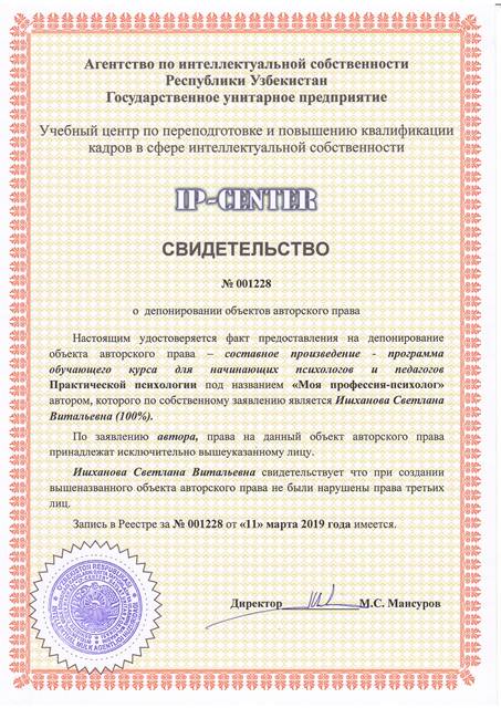 | 8960 | №001228 | Составное произведение - программа обучающего курса для начинающих психологов и педагогов Практической психологии - "Моя профессия-психолог" | Ишханова Светлана Витальевна (100%) | Ишханова Светлана Витальевна | 03/11/2019 | ![]() |