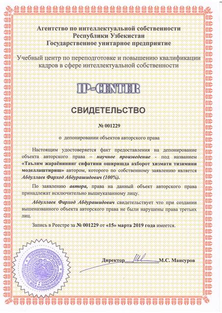 | 8959 | №001229 | Научное произведение - "Таълим жараёнининг сифатини оширишда ахборот хизмати тизимини моделлаштириш" | Абдуллаев Фарход Абдурашидович (100%) | Абдуллаев Фарход Абдурашидович | 03/15/2019 | ![]() |