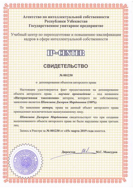 | 8958 | №001230 | Научное произведение - "Интерактивная таксономия" | Шамсиева Дилором Мардоновна (100%) | Шамсиева Дилором Мардоновна | 03/15/2019 | ![]() |