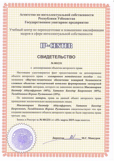 | 8957 | №001231 | Электронный методическое пособие - "Научно-техническое обеспечение пожарной безопасности сложных объектов: методический комплекс формирования экспертной системы знаний" | Мавлянкариев Бахтиёр Абдугафурович (40%), Хатамов Баходир Бахромович (40%), Талибджанов Исроил Рустамович (20%) | Мавлянкариев Бахтиёр Абдугафурович, Хатамов Баходир Бахромович, Талибджанов Исроил Рустамович | 03/15/2019 | ![]() |