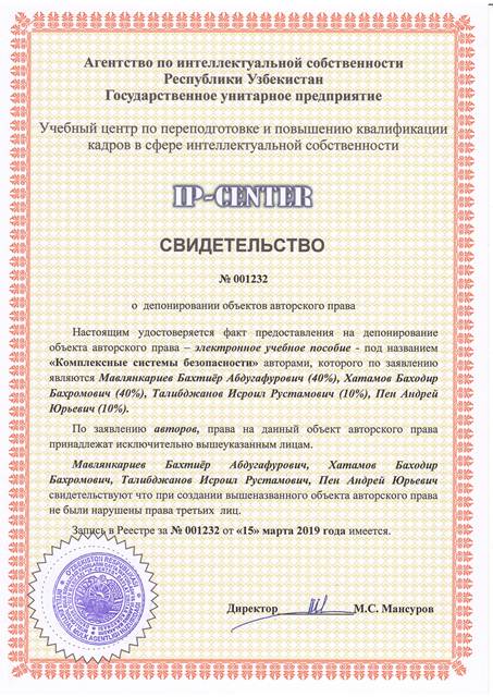 | 8956 | №001232 | Электронное-учебное пособие - "Комплексные системы безопасности" | Мавлянкариев Бахтиёр Абдугафурович (40%), Хатамов Баходир Бахромович (40%), Талибджанов Исроил Рустамович (10%), Пен Андрей Юрьевич (10%) | Мавлянкариев Бахтиёр Абдугафурович, Хатамов Баходир Бахромович, Талибджанов Исроил Рустамович, Пен Андрей Юрьевич | 03/15/2019 | ![]() |