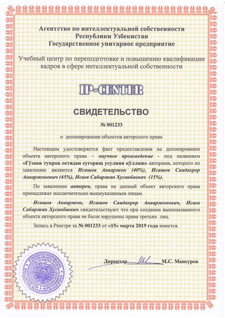 | 8955 | №001233 | Научное произведение - "Ғўзани тупроқ остидан суғориш усулини қўллаш" | Исашов Анваржон (40%), Исашев Саидахрор Анваржонович (45%), Исаев Сабиржан Хусанбаевич (15%) | Исашов Анваржон, Исашев Саидахрор Анваржонович, Исаев Сабиржан Хусанбаевич | 03/15/2019 | ![]() |