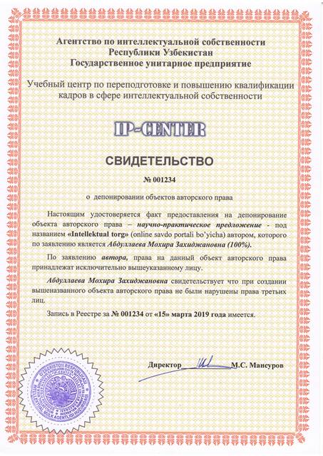 | 8954 | №001234 | Научно-практическое предложение - "Intellektual torg" (online savdo portali bo'yicha) | Абдуллаева Мохира Захиджановна (100%) | Абдуллаева Мохира Захиджановна | 03/15/2019 | ![]() |