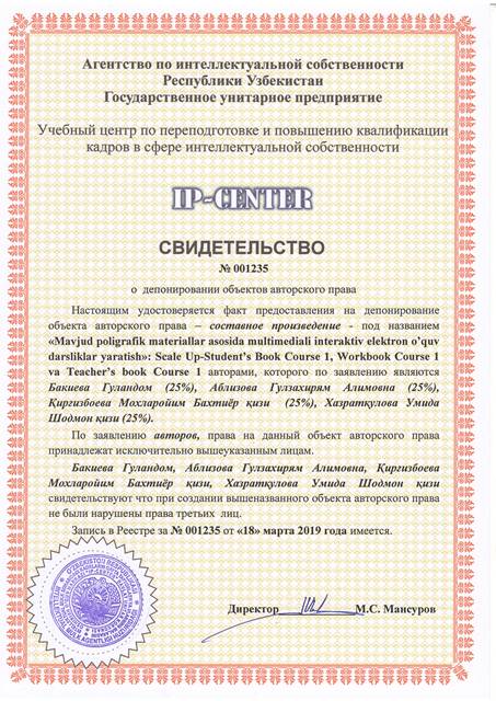 | 8953 | №001235 | Составное произведение - "Mavjud poligrafik materiallar asosida multimediali interaktiv elektron o’quv darsliklar yaratish»: Sсale Up-Student’s Book Course 1, Workbook Course 1 va Teacher’s book Course 1" | Бакиева Гуландом (25%), Аблизова Гулзахирям Алимовна (25%), Қирғизбоева Мохларойим Бахтиёр қизи (25%), Хазратқулова Умида Шодмон қизи (25%) | Бакиева Гуландом, Аблизова Гулзахирям Алимовна, Қирғизбоева Мохларойим Бахтиёр қизи, Хазратқулова Умида Шодмон қизи | 03/18/2019 | ![]() |