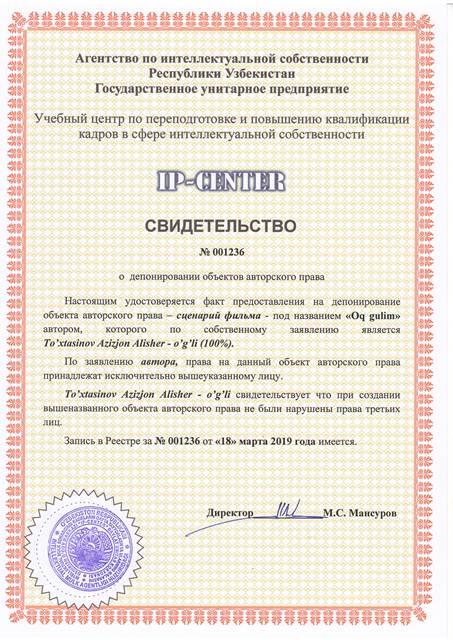| 8952 | №001236 | Сценарий фильма - "Oq gulim" | To’xtasinov Azizjon Alisher - o’g’li (100%) | To’xtasinov Azizjon Alisher - o’g’li (100%) | 03/18/2019 | ![]() |