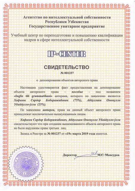 | 8951 | №001237 | Пособия - "Ingliz tili grammatikasi" | Хафизов Сардор Боборажабович (75%), Абдуллаев Омонулло Убайдулло-ўғли (25%) | Хафизов Сардор Боборажабович, Абдуллаев Омонулло Убайдулло-ўғли | 03/19/2019 | ![]() |
