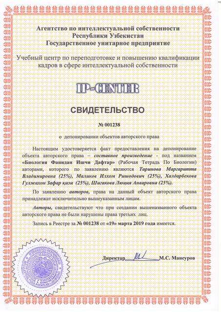 | 8950 | №001238 | Составное произведение - "Биология Фанидан Ишчи Дафтар" (Рабочая Тетрадь По Биологии) | Таринова Маргаритта Владимировна (25%), Маликов Илхом Ришодович (25%), Халдарбекова Гулжахон Зафар қизи (25%), Шигакова Люция Анваровна (25%) | Таринова Маргаритта Владимировна (25%), Маликов Илхом Ришодович (25%), Халдарбекова Гулжахон Зафар қизи (25%), Шигакова Люция Анваровна (25%) | 03/19/2019 | ![]() |